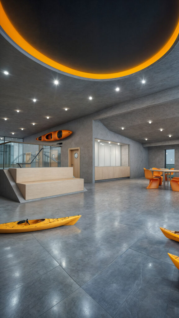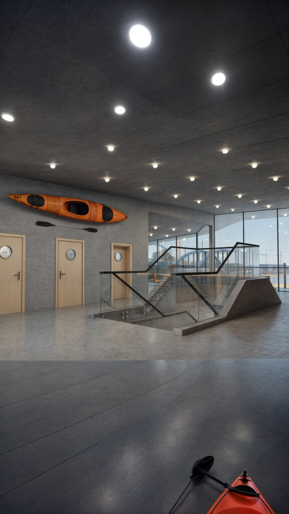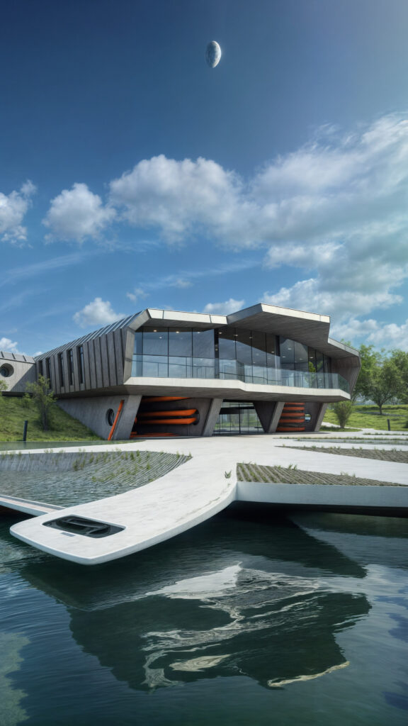 Ein modernes Sportgebäude mit futuristischer Architektur.