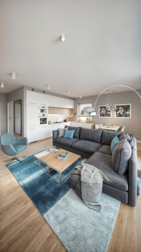 Visualisierungen des Wohnzimmers mit Küchenzeile, in denen Holz für Gemütlichkeit und Wärme sorgt.