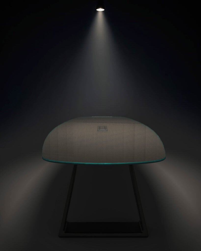 Die Visualisierungen zeigen eine minimalistische Form mit deutlich gezeichneter Carbon-Textur, bedeckt von einer Platte aus gehärtetem Glas. Das Ganze ruht auf einer soliden, geometrischen Basis mit mattem Finish, was den industriellen und zugleich eleganten Charakter des Projekts unterstreicht.