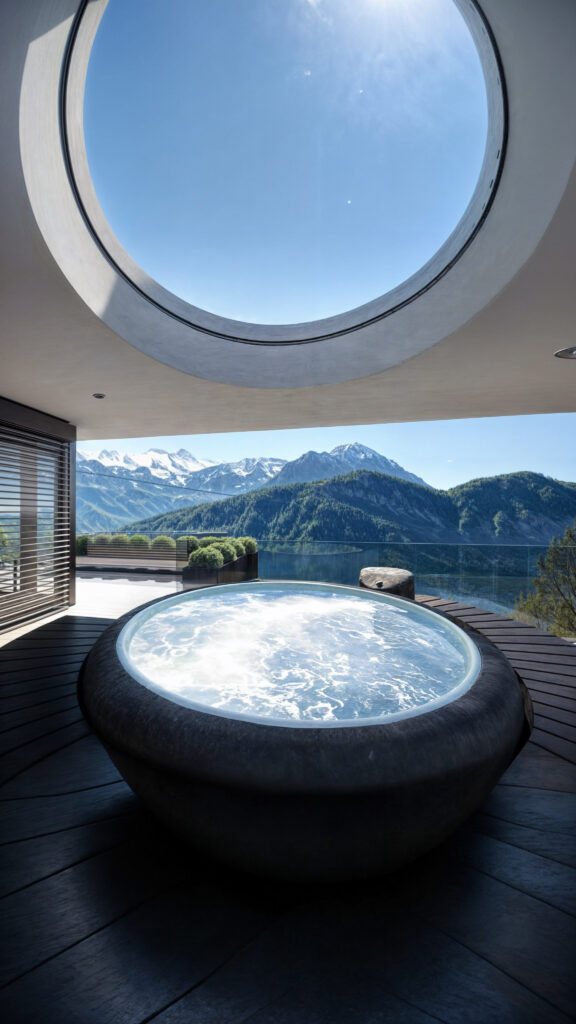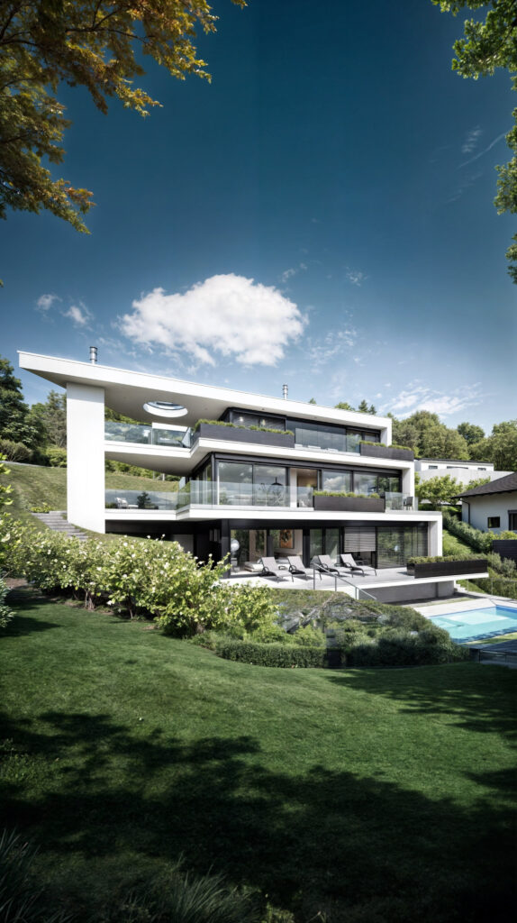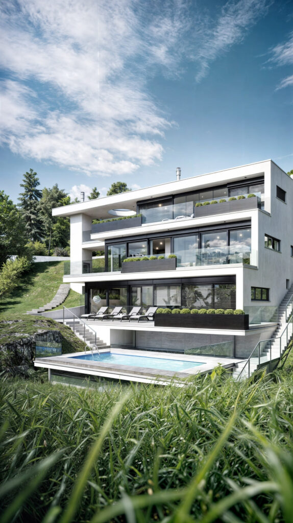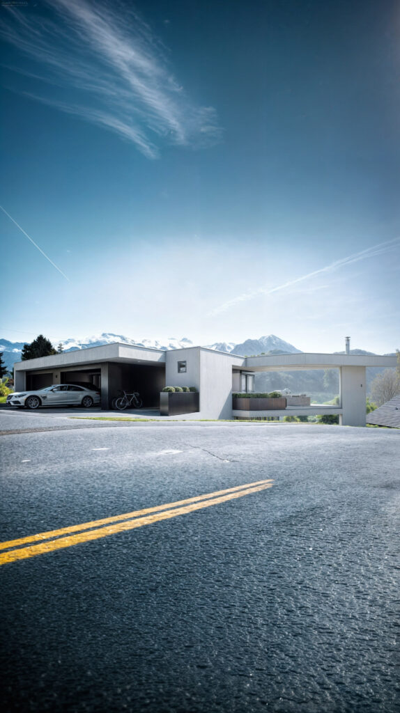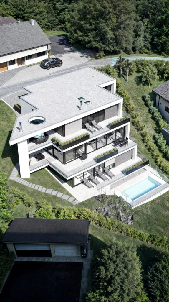 Wir bieten professionelle 3D-Visualisierungen moderner Gebäude an, wie diese Luxusvilla mit Blick auf die Alpen in Weggis, Schweiz. Diese fotorealistische Visualisierung zeigt das außergewöhnliche Design des Gebäudes und hebt seine moderne Architektur sowie die spektakuläre Aussicht auf die Berge hervor. Weitere Aufnahmen präsentieren auch luxuriöse Elemente wie einen Jacuzzi mit Alpenblick, einen privaten Pool und großzügige Terrassen, die ein umfassendes Bild des Projekts schaffen. Unsere Visualisierungen helfen Investoren und Bauträgern bei der Präsentation außergewöhnlicher Projekte vor Kunden.