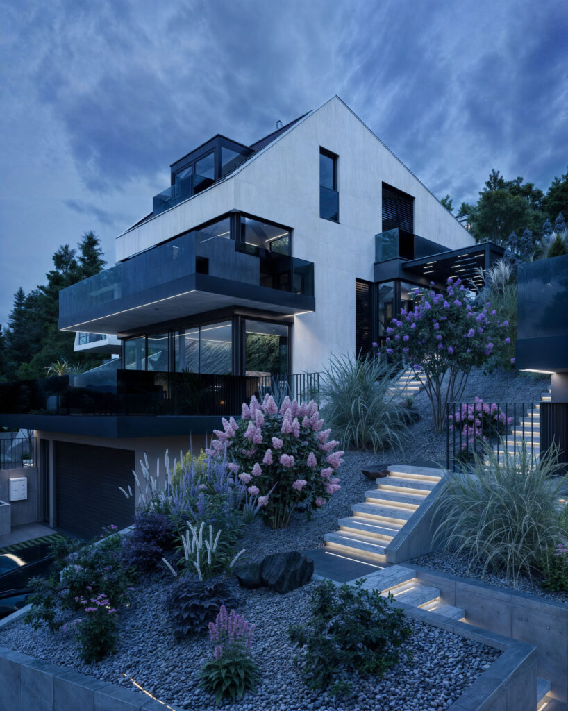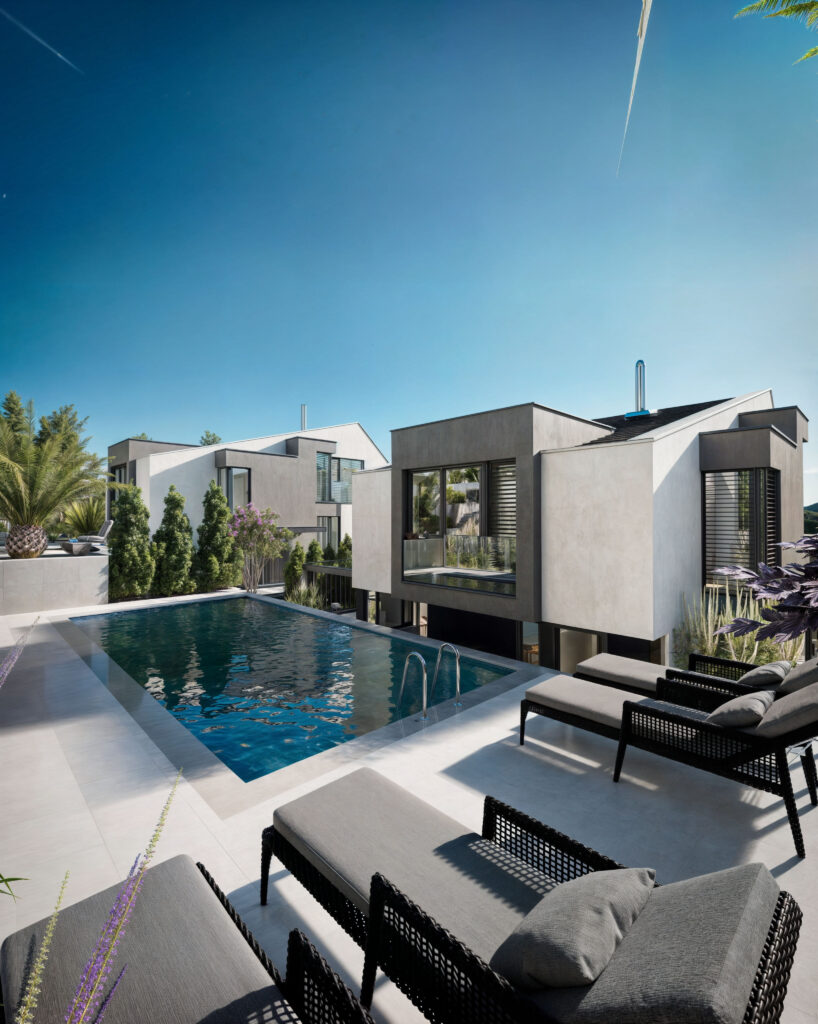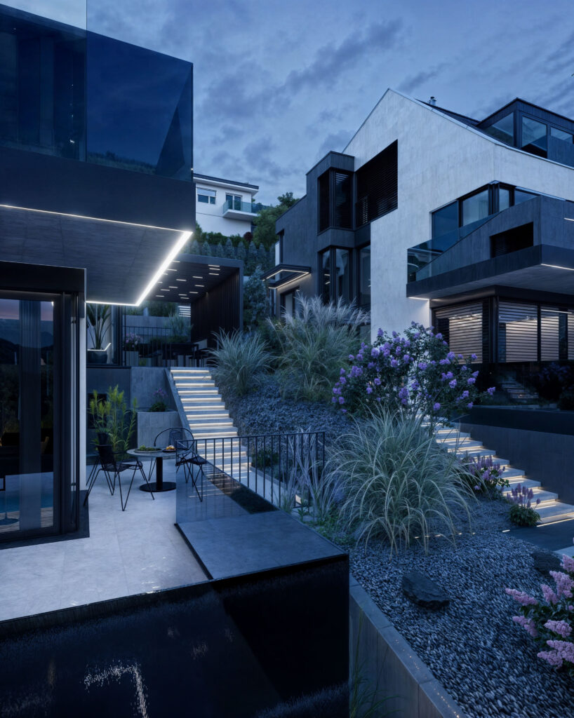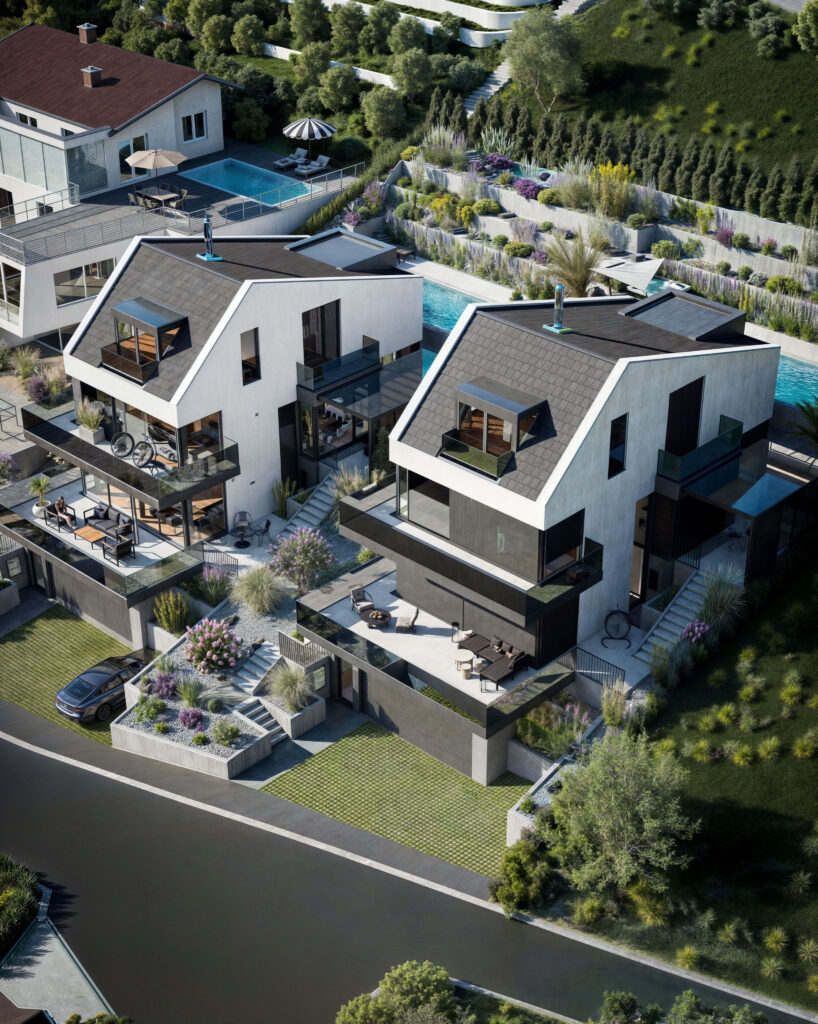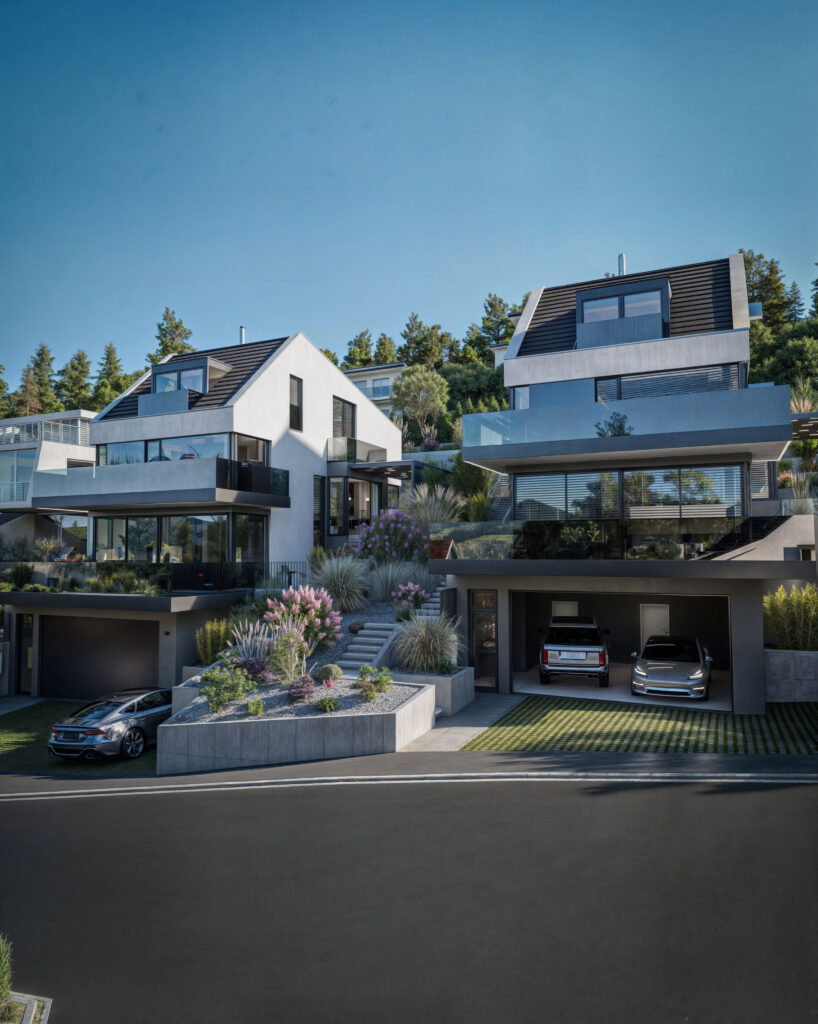 Wir präsentieren 3D-Visualisierungen von zwei exklusiven Einfamilienhäusern in Muttenz, Schweiz, die moderne Architektur und Eleganz in jedem Detail zeigen. Das Projekt umfasst realistische Außenaufnahmen sowohl bei Tages- als auch bei Abendbeleuchtung, sodass man sehen kann, wie sich die Gebäude zu verschiedenen Tageszeiten harmonisch in die Landschaft einfügen. Großzügige Terrassen, moderne Oberflächen und große Verglasungen schaffen eine eindrucksvolle Verbindung zur natürlichen Umgebung.
