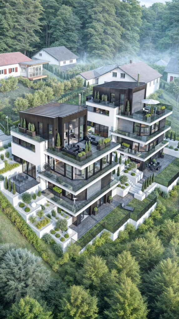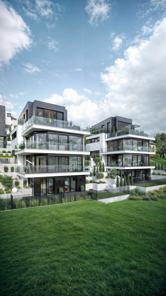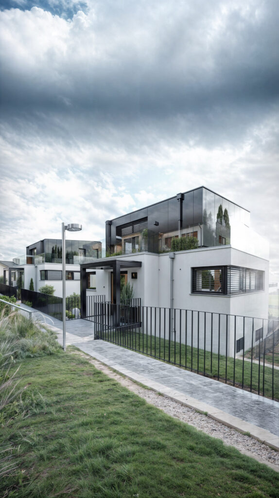 Wir präsentieren die Visualisierung von zwei modernen Häusern in Unterkulm, Schweiz. Die Gebäude zeichnen sich durch elegante Architektur und beeindruckende Penthäuser auf dem Dach aus. Die Visualisierungen zeigen die Abendbeleuchtung, die ihren modernen Charakter unterstreicht, sowie Luftaufnahmen und die Außenarchitektur. Unsere fotorealistischen Visualisierungen zeigen eine einzigartige Kombination aus Ästhetik und Funktionalität und schaffen einen harmonischen Raum, ideal zum Leben.