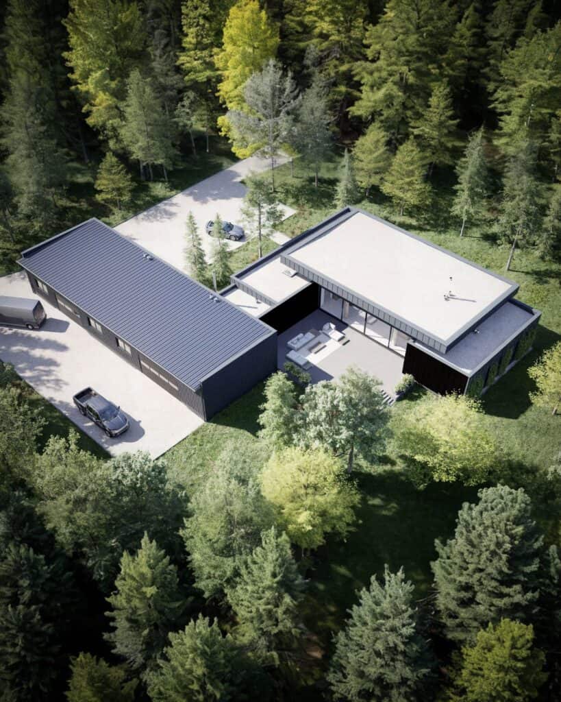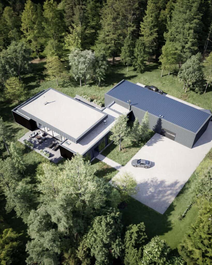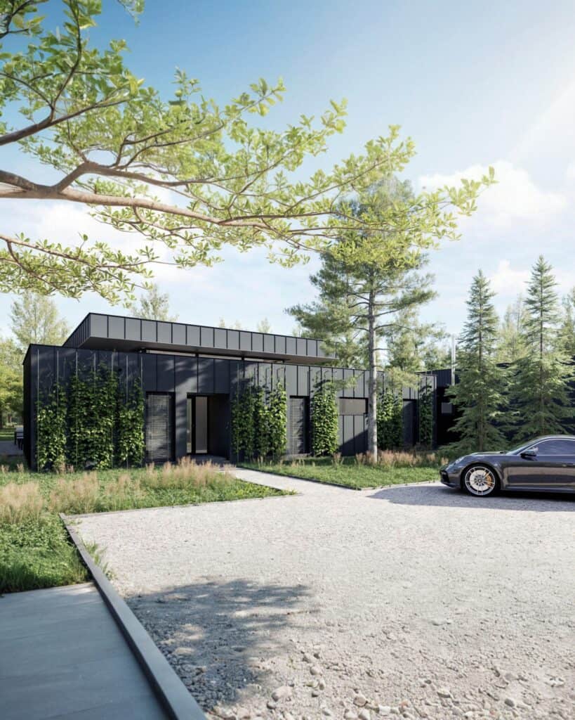 Der eingeschossige Einfamilienhausentwurf fügt sich dezent in den Kiefernwald von Radziejowice ein. Die L-förmige Grundrissfigur öffnet die Wohnräume zu einem geschützten Patio, während matte schwarze Metallpaneele und verkohltes Holz die minimalistische Formensprache betonen. Großzügige Verglasungen rahmen den Blick ins Grün, lassen Innen- und Außenraum verschmelzen und gewährleisten zugleich hohe Energieeffizienz.